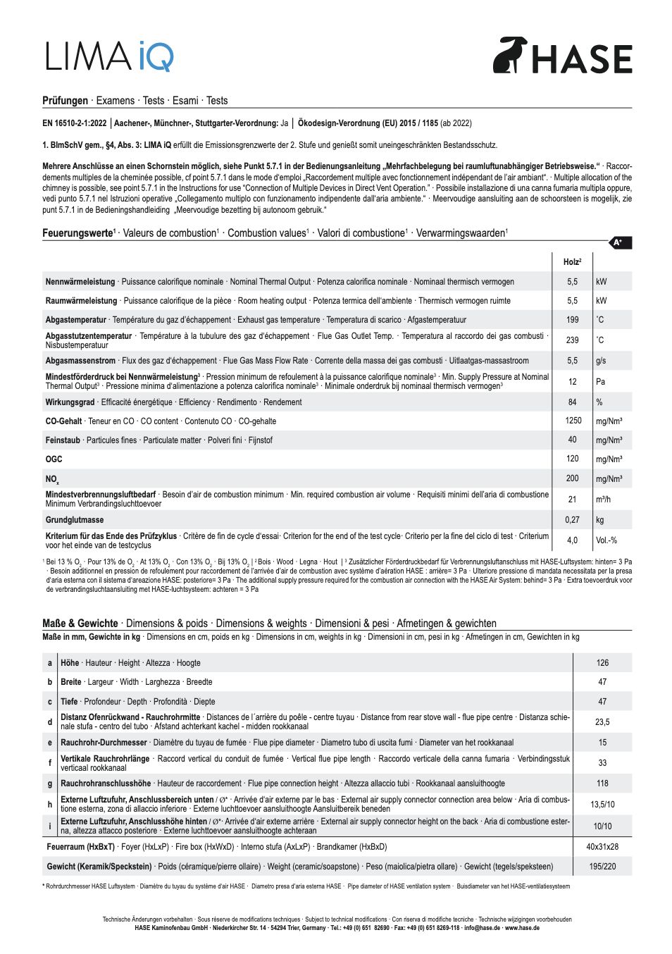 - LIMA ist DIBt-geprüft. Jeder Kaminofen ist einzeln auf Dichtigkeit getestet. Er kann raumluftunabhängig angeschlossen werden (Hase Luftsystem wird benötigt)