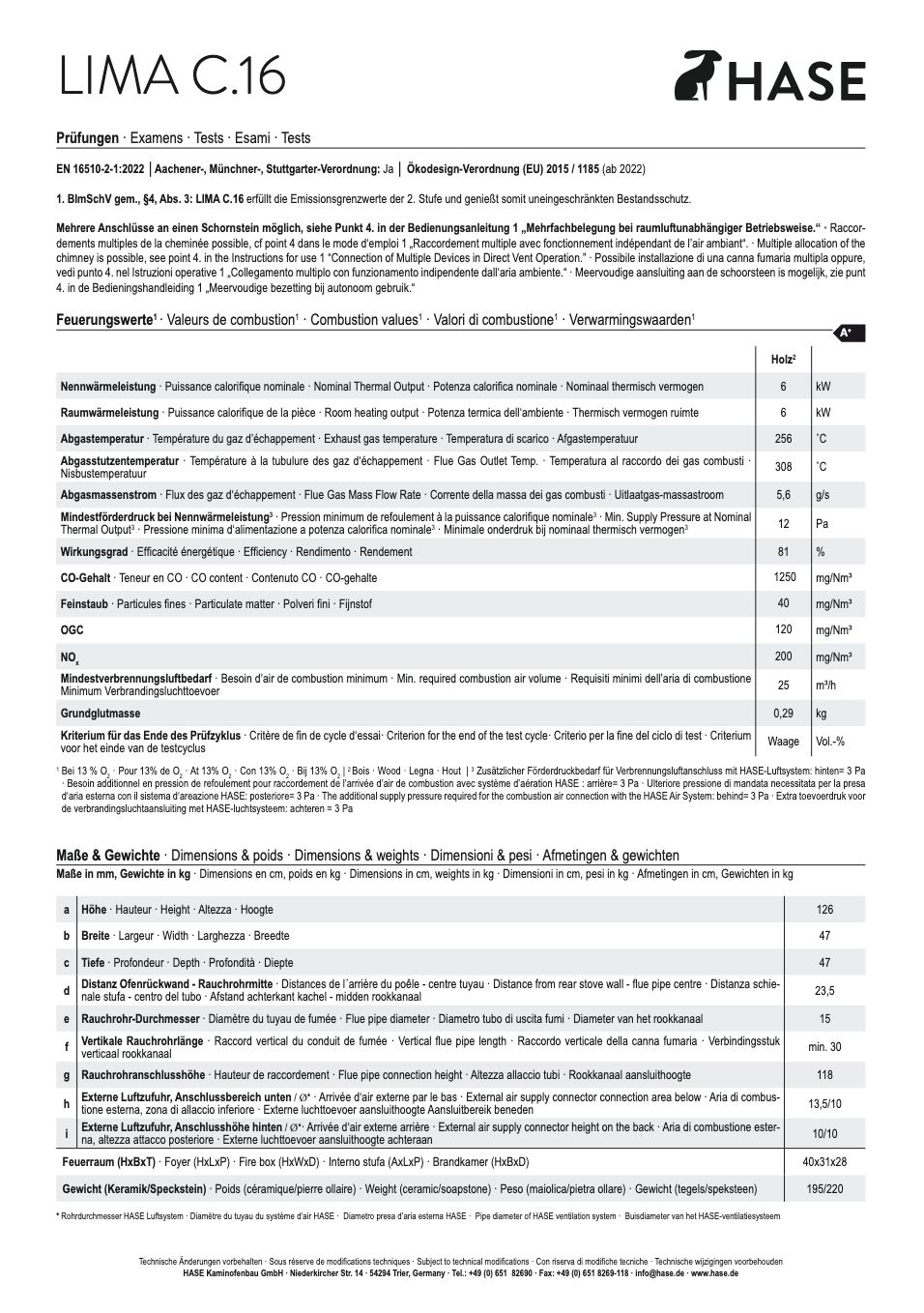 - LIMA ist DIBt-geprüft. Jeder Kaminofen ist einzeln auf Dichtigkeit getestet. Er kann raumluftunabhängig angeschlossen werden (Hase Luftsystem wird benötigt)